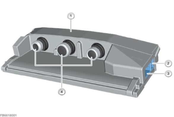 Исполнение High с 3 линзами, в зависимости от системы поддержки. 1 — ЭБУ KAFAS; 2 — 2-полюсное штекерное соединение (обогрев камеры); 3 — Разъем 10‐контактный (кабельная сеть автомобиля); 4 — 3 линзы.