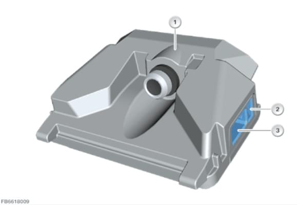 Вариант Mid с 1 линзой, в зависимости от системы поддержки. 1 — ЭБУ KAFAS; 2 — 2-полюсное штекерное соединение (обогрев камеры); 3 — Разъем 10‐контактный (кабельная сеть автомобиля).
